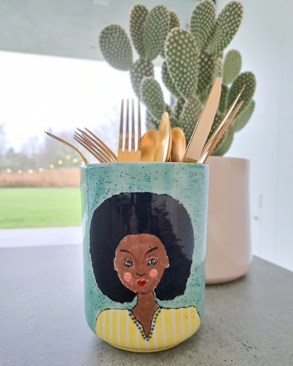 Zo kwam bijvoorbeeld mijn eerste mini-collectie tot stand, één voor één unieke met de hand geschilderde keramieken stukken die een ode zijn aan alle vrouwen. Het is een mix van random dames, zoals jij en ik, en bekende dames.